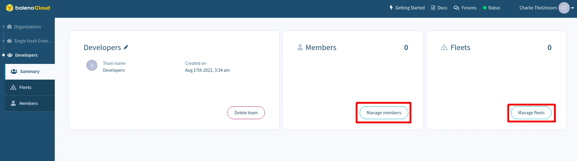 Once the team is created, add members or grant the team access to fleets by clicking on the `Manage members` and `Manage fleets` buttons, respectively.