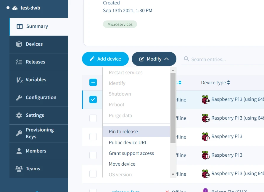 * On the Devices page, you can select one or more devices using the checkboxes present on the table. Next, open the `Modify` menu and select the `Pin to release` option.