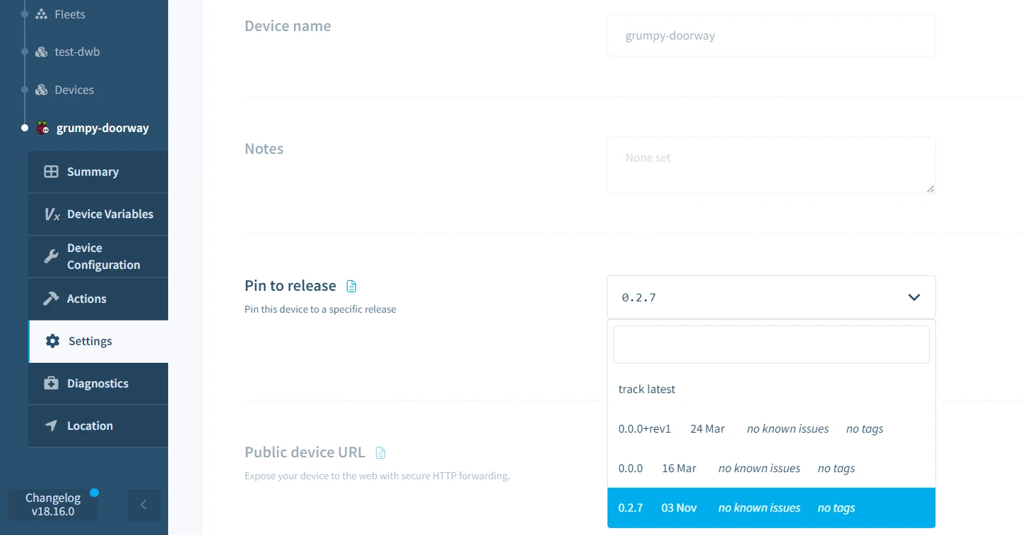 There are several ways to achieve this from the Device dashboard. The dropdown options are identical to the ones when trying to pin the fleet to a release: