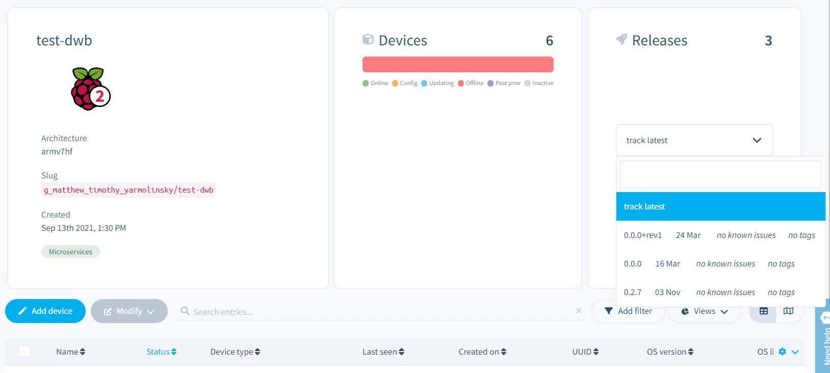 * Track latest: `balena fleet track-latest <FLEET_SLUG>`