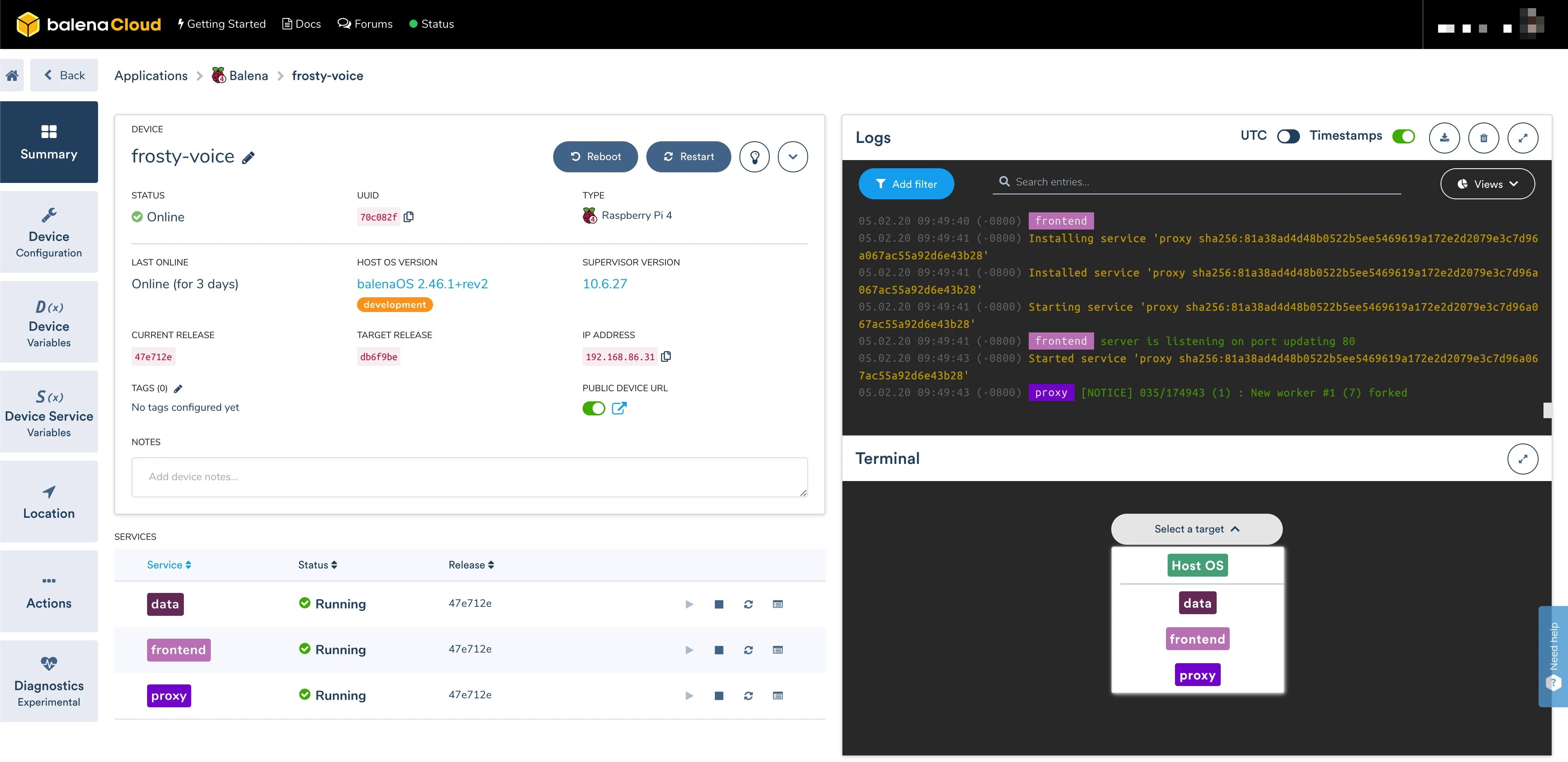 Once your services are up and running, you can use the dashboard to monitor and interact with them. Messages from the device supervisor, as well as anything written by your services to `stdout` and `stderr`, will appear in the *Logs* window, which can be filtered by service. Our built-in [web terminal](https://docs.balena.io/learn/manage/ssh-access) allows you to SSH into any running services, as well as the underlying host OS.