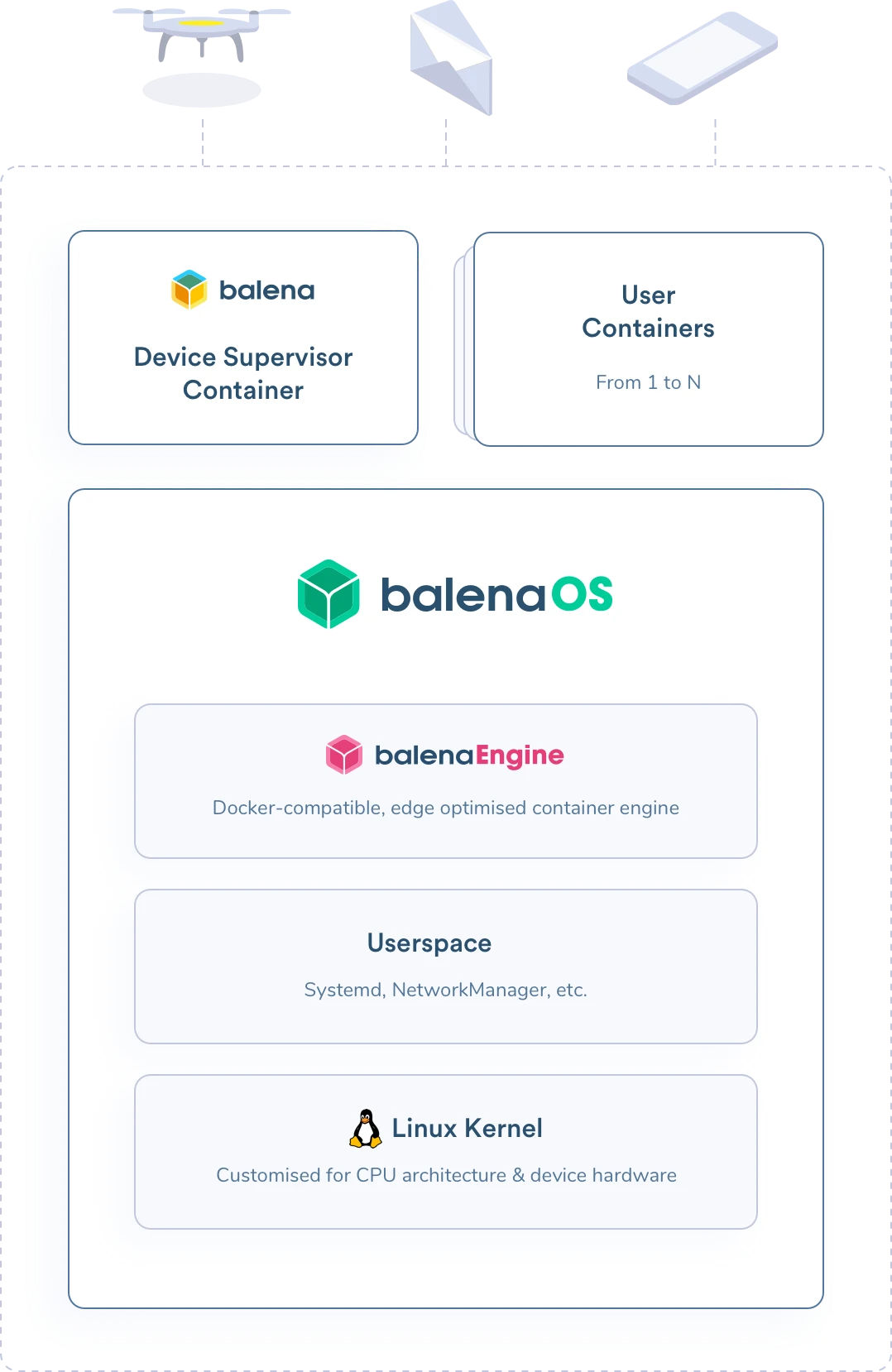 Devices in the balena ecosystem run [balenaOS](https://www.balena.io/os), a bare-bones, [Yocto Linux](https://www.yoctoproject.org/) based host OS, which comes packaged with [balenaEngine](https://www.balena.io/engine), our lightweight, [Docker](https://www.docker.com/)-compatible container engine. The host OS is responsible for kicking off the device supervisor, balena's agent on your device, as well as your containerized services. Within each service's container you can specify a base OS, which can come from any existing Docker base image that is compatible with your device architecture. The base OS shares a kernel with the host OS, but otherwise works independently. If you choose, your containers [can be configured](https://docs.balena.io/learn/develop/multicontainer) to run as privileged, access hardware directly, and even inject modules into the kernel. The balena device supervisor runs in its own container, which allows the device to continue running and pulling new code even if your application crashes.