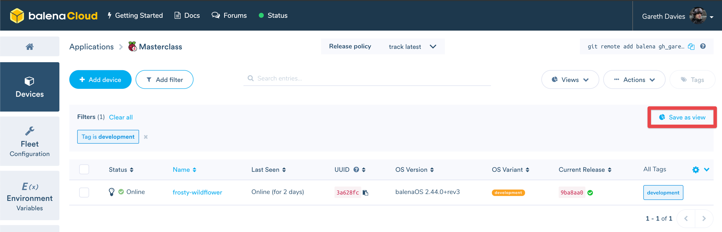 Views allow us to save filters, rather than having to reenter them each time we want to filter our devices. For example, we will save the current filter, which selects all devices with a tag name of devDevice to a view named Development Devices. Create this view by selecting the Save as view link, which is visible whenever there is a filter applied.