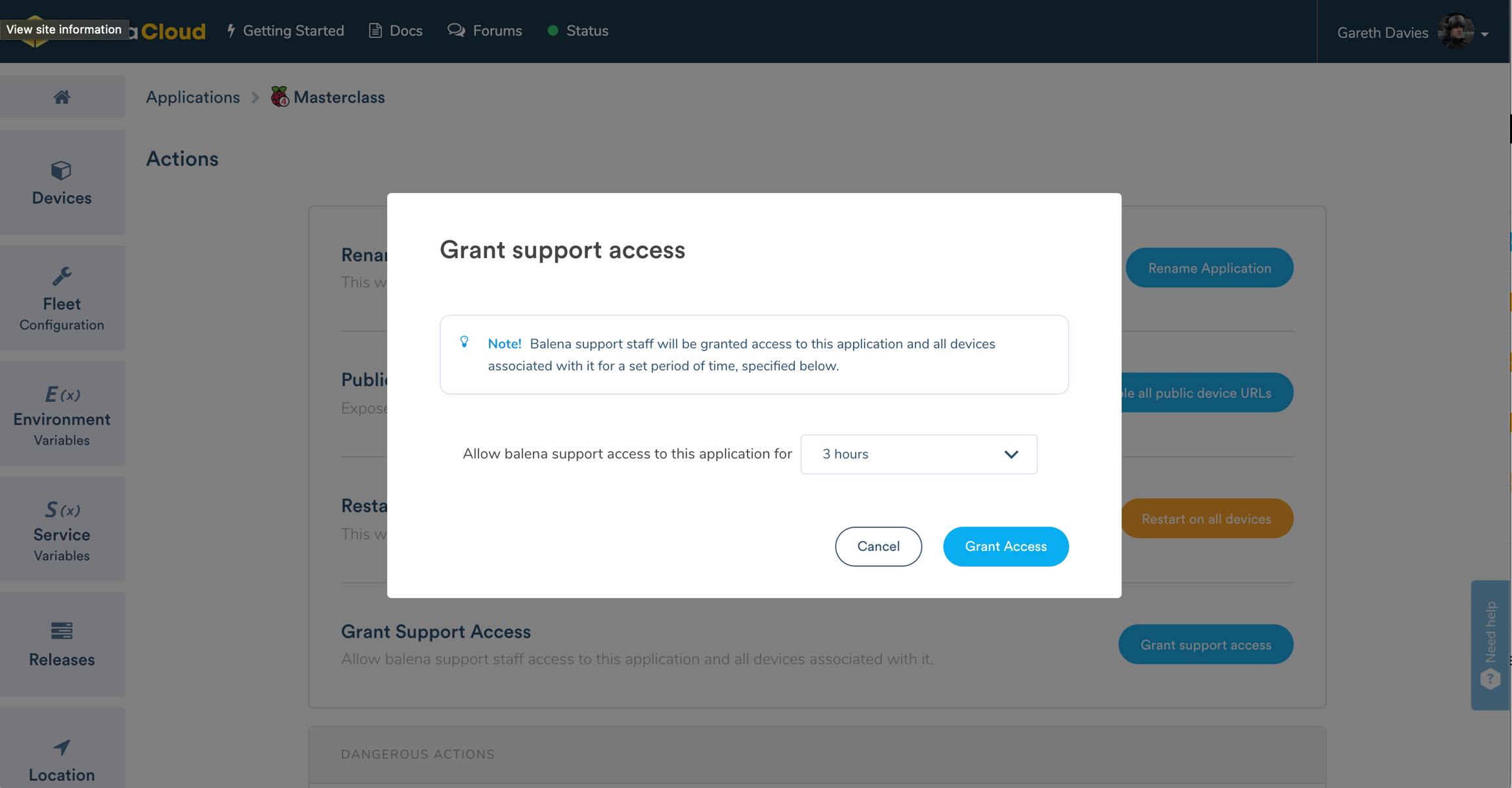 To enable support access for a single device, select the Actions menu in the Device dashboard, and choose the Grant Support Access button and choose the period of time to grant device access. You may revoke access at any time by selecting Revoke Support Access on the same page.