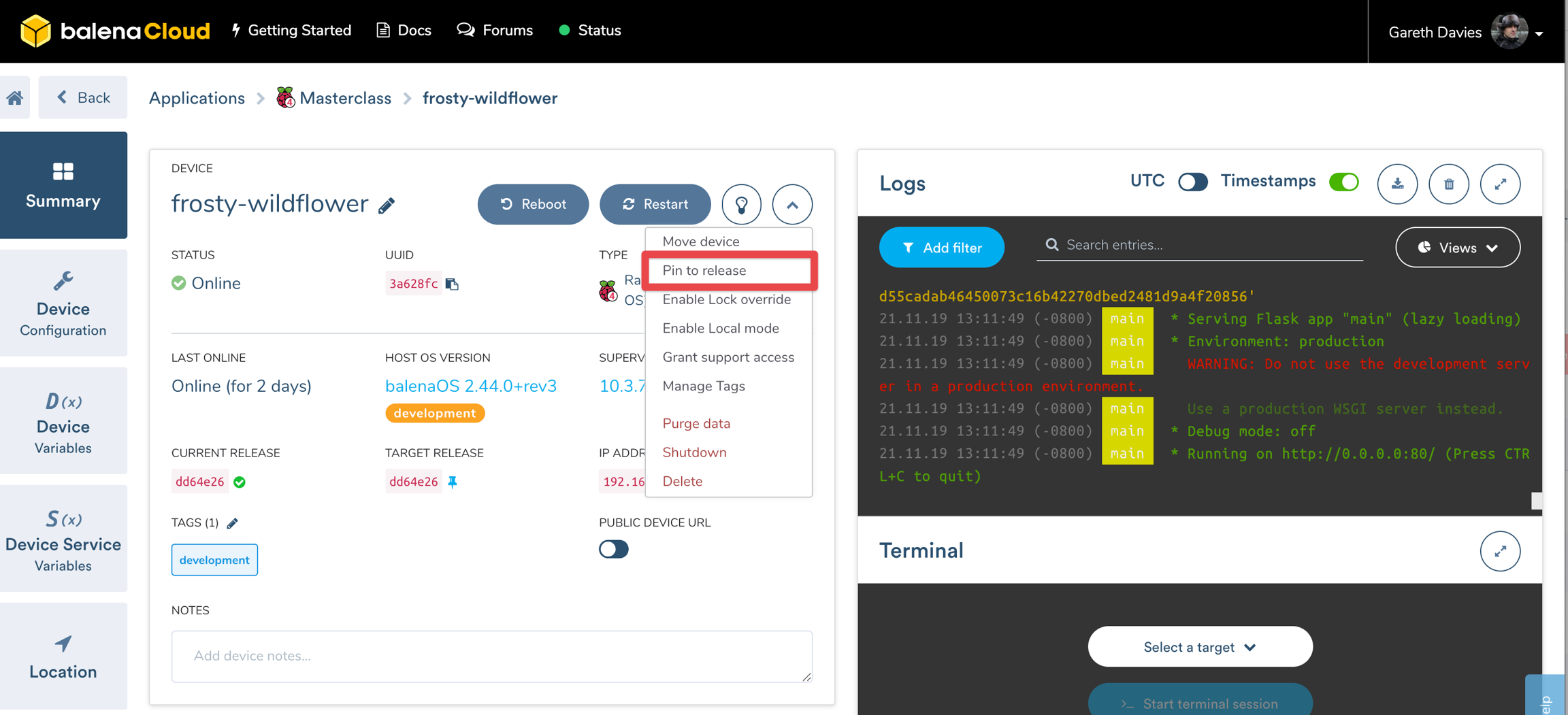 The service itself is a simple Python Flask service, which we will use to echo details about the code running on the device by either accessing the device in the browser or via the curl command from the terminal of your development machine. Using the UUID.local syntax of your device issue the following command: