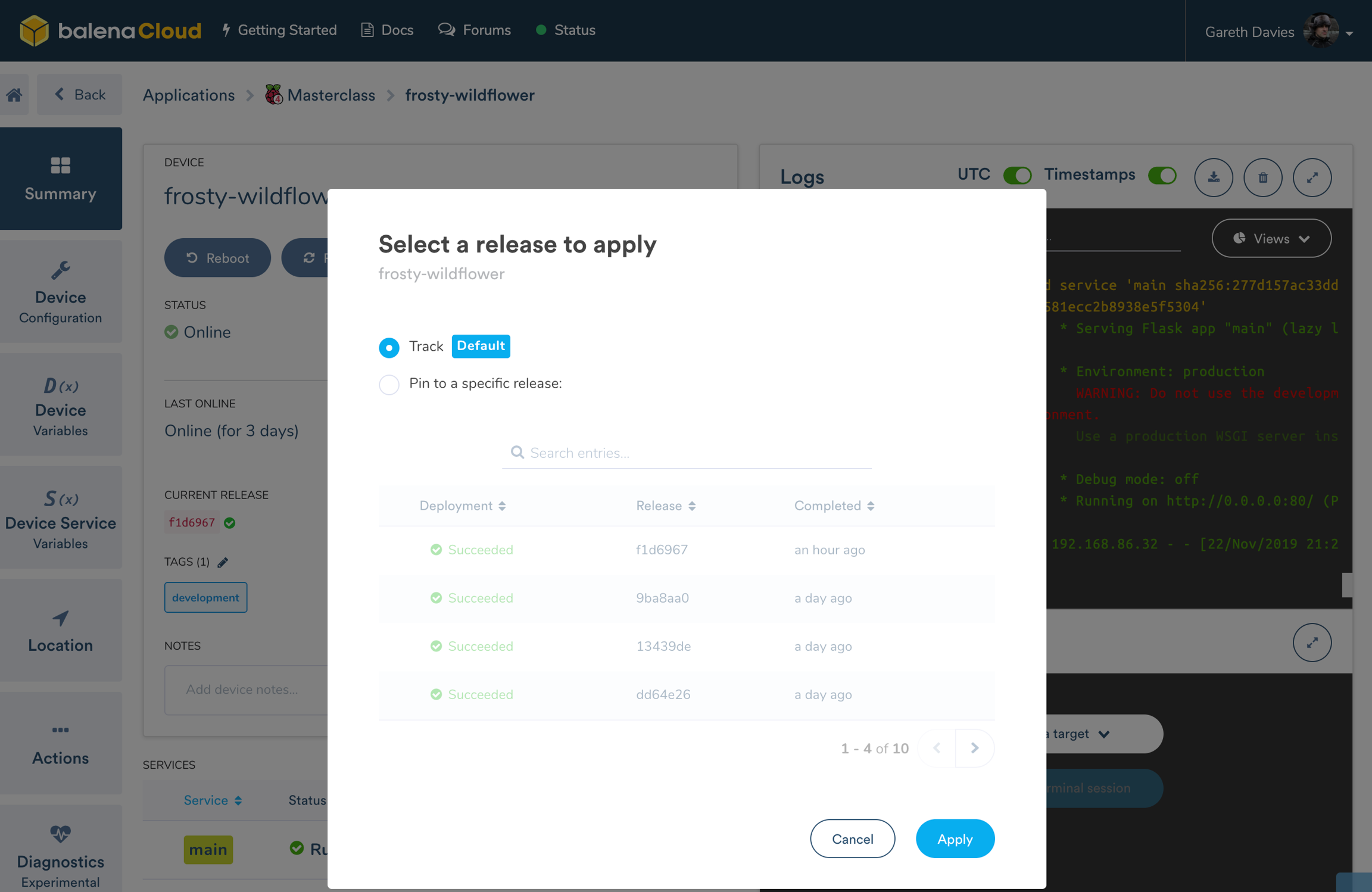 As well as pinning an entire fleet to a specific release, you may pin individual devices. By default, all devices track the fleet release policy. However, you may wish to run a different release on select devices, for example, a development device or when performing a canary deployment where a subset of devices receive the update to evaluate it before pushing more widely.
