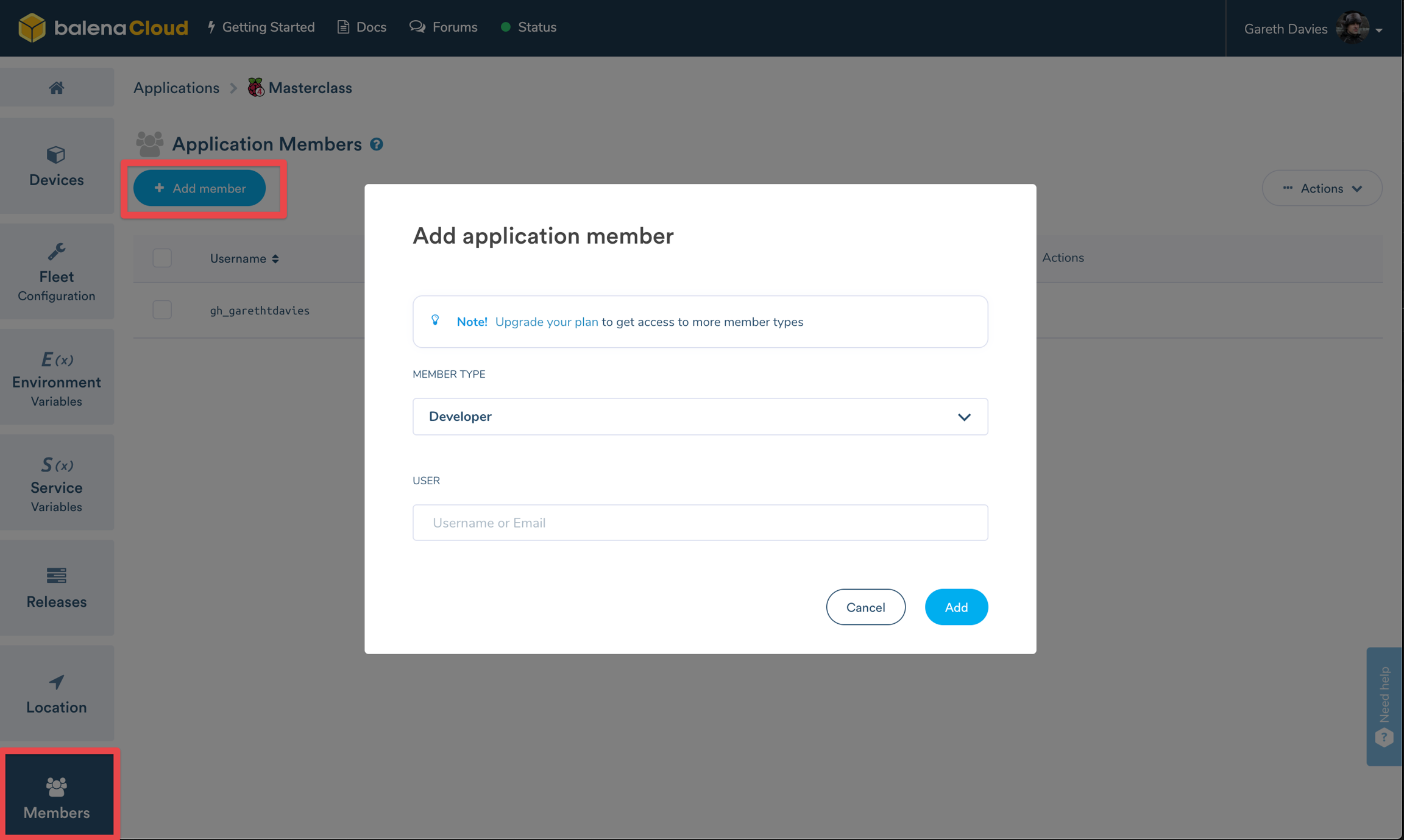 In balenaCloud, there are multiple member types, each offering different permissions (some of which are only available to paid plans). You can add members to the fleet on the Members tab of the dashboard: