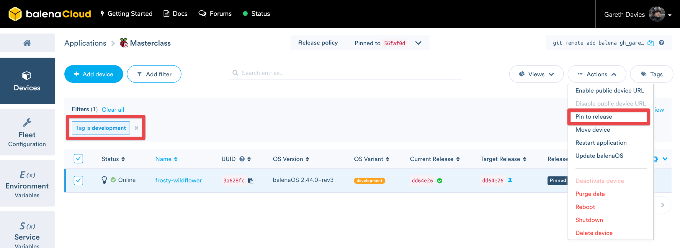 In the last exercise, we pushed a release that we tagged as version:v1.0.0. We want our fleet to remain on this release even if newer releases are deployed (for example, we may wish to test the newer releases on a subset of devices before we push to the remainder of the fleet).