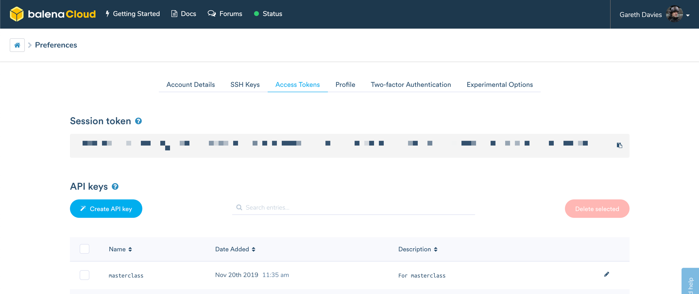 During the masterclass, we will use the balena API to manage the fleet and device(s). To get started using the API, you need an access token. Access tokens are managed via the Access tokens tab of the Preferences page of the dashboard.