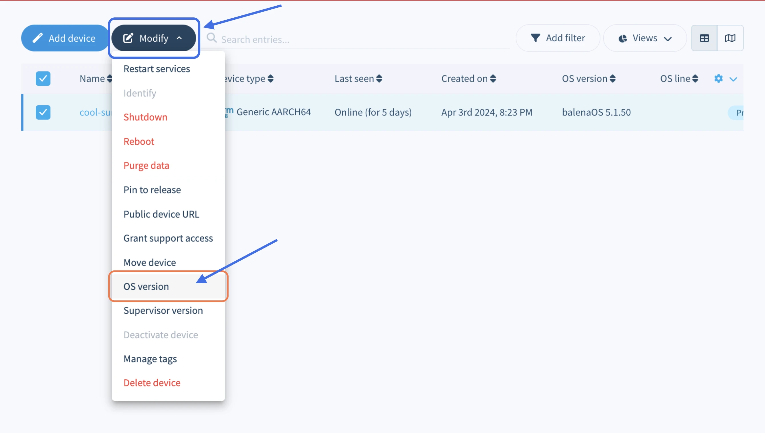 Updates can also be made to multiple devices in the same fleet. From the device list, click the checkbox to the left of any online devices you wish to update. Then use the *Modify* dropdown to choose the *OS version* option to set and trigger an update on all selected devices.